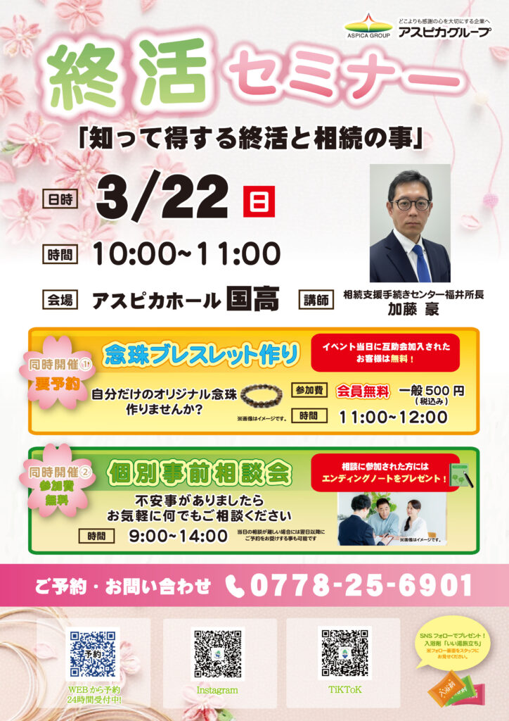 【アスピカホール国高】人気の念珠ブレスレット作り&知って得する終活セミナー開催