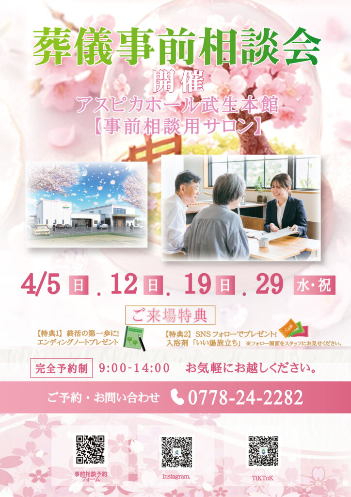 本日はアスピカホール武生本館、4月開催 葬儀事前相談会のご案内です✨